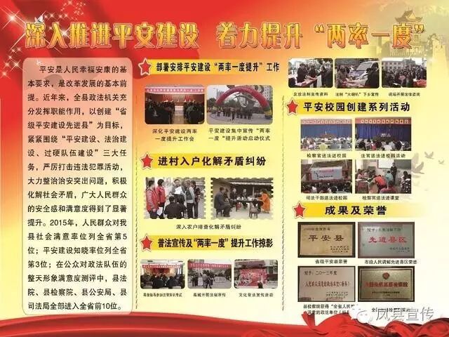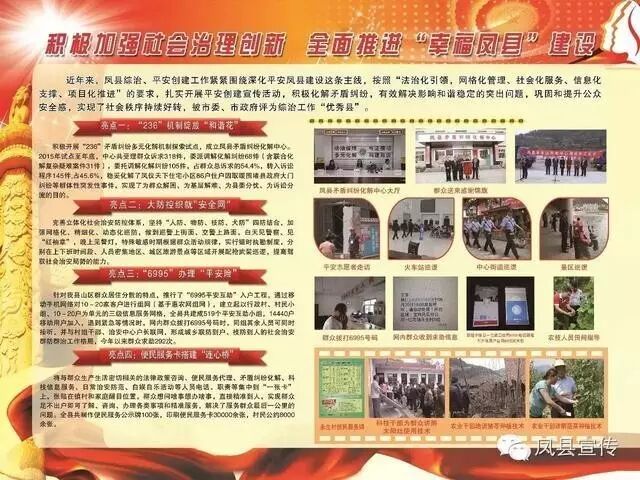 近年来,凤县紧紧围绕深化平安建设这一主线,全力抓好治安防控体系建设、矛盾纠纷排查化解、特殊人群服务管理、社会力量综合参与、基层基础网络构建五项重点工作,综治维稳工作扎实推进,社会秩序持续好转,公众安全感大幅上升,连续五年“两率一度”测评位于省市前列。2015年,凤县社会治安满意率达到96.15%,位列全省第5位;平安建设知晓率达到97.34%,位列全省第3位,公检法司满意度全部进入全省前5位,被评为全市综治工作优秀县。
