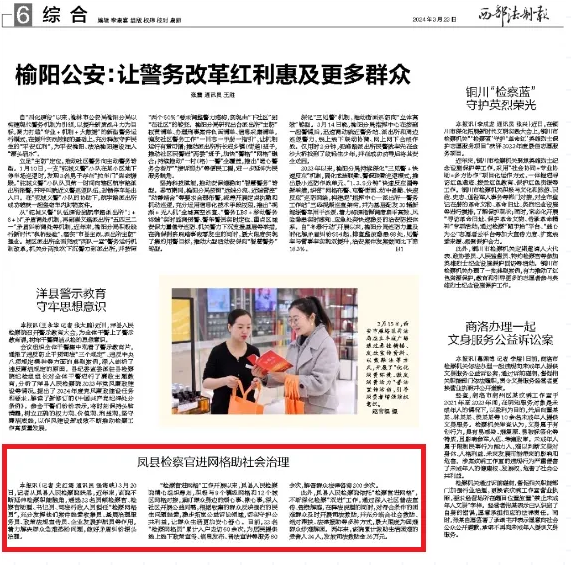 本报讯(记者 史红海 通讯员 强海霞)3月20日,记者从凤县人民检察院获悉,近年来,该院不断延伸检察职能触角,遴选22名员额检察官、检察官助理、书记员、司法行政人员担任“检察网格员”,充分发挥他们案件线索收集员、基层治理服务员、政策法规宣传员、企业发展护航员等作用,着力解决群众急难愁盼问题,做好矛盾纠纷源头治理。