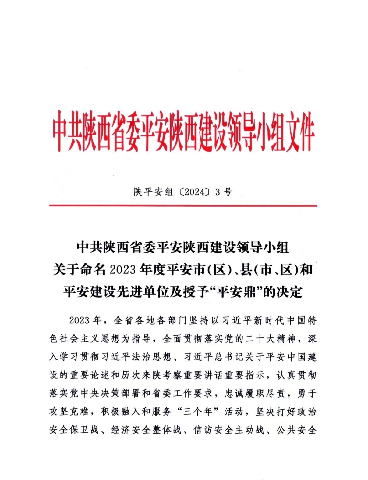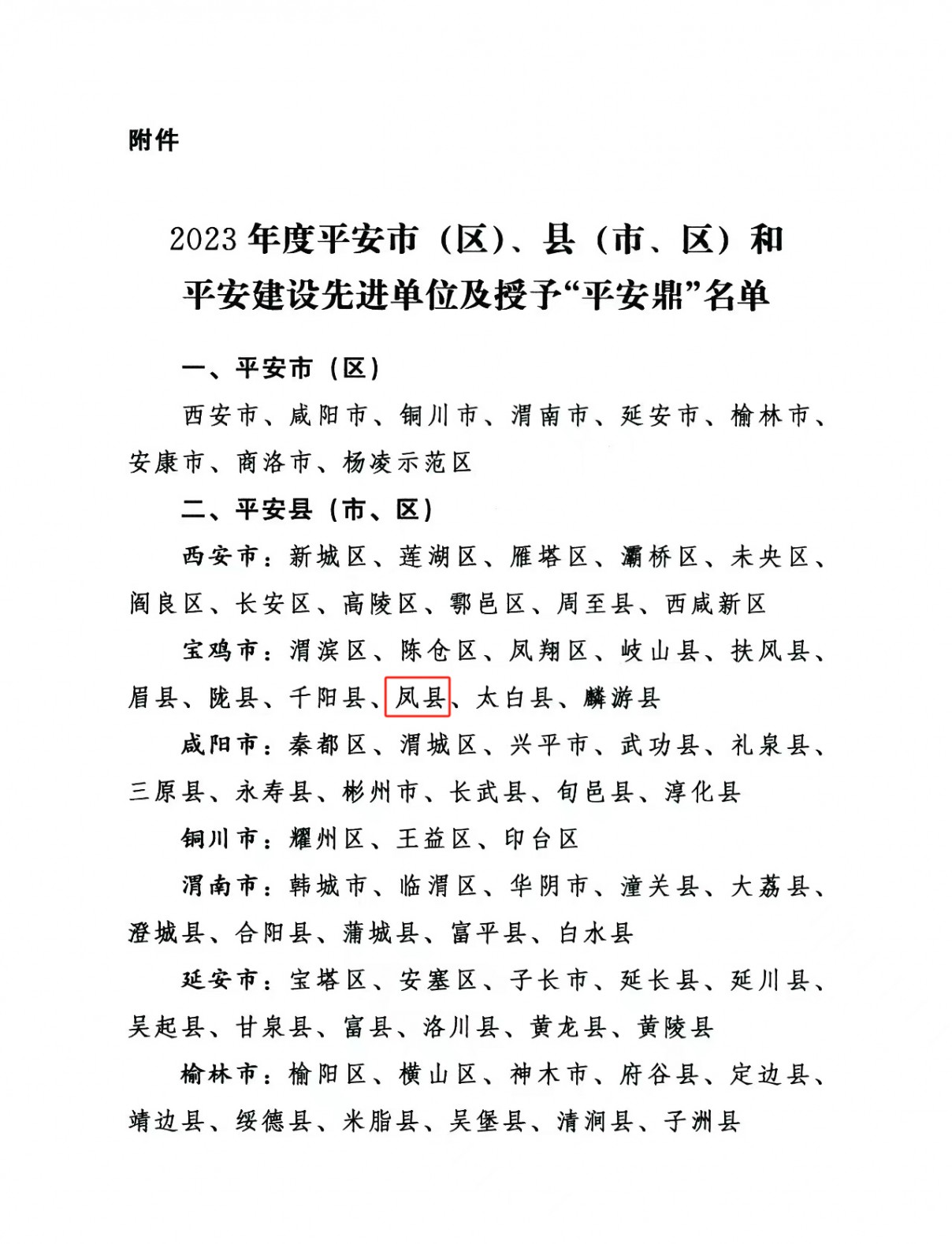 | 3月21日,平安陕西建设工作会议召开,会上通报了《关于命名2023年度平安市(区)、县(市、区)和平安建设先进单位及授予“平安鼎”的决定》,凤县荣获“2023年度省级平安县”称号,这是自2019年以来,我县连续五年荣获省级“平安县”殊荣。