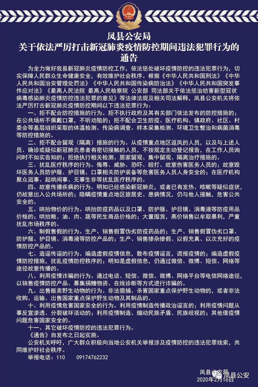 凤县公安局关于依法严厉打击新冠肺炎疫情防控期间违法犯罪行为的通告 |