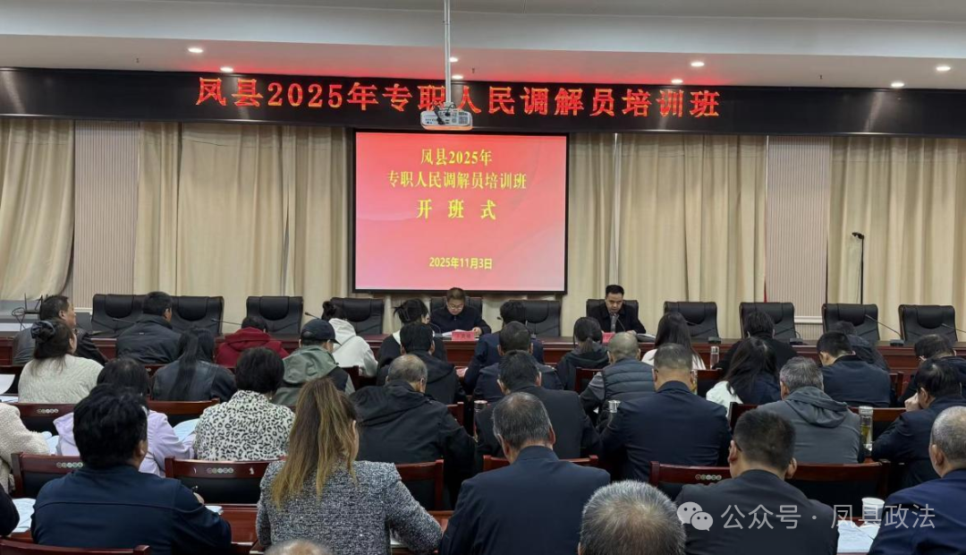 | 为坚持发展新时代“枫桥经验”,进一步提升全县镇村(社区)专职人民调解员业务能力和素质,2025年11月3日至4日,凤县县委政法委(县司法局)在县委党校举办了凤县2025年专职人民调解员培训班,全县80余名镇、村(社区)专职人民调解员参加培训。县委常委、政法委书记王商峰出席会议并作开班讲话。