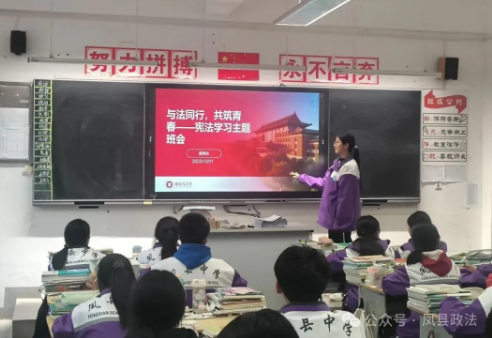 12月1日,凤县中学宪法宣传周活动正式启动。清晨,全校师生齐聚操场,参加主题升旗仪式,学生代表以“宪法在我心中”为题作国旗下讲话,展现出青年学子对宪法精神的深刻理解与思考。德育处主任的致辞,更是成为鼓励学生将爱国情怀、法治意识和奋斗志向融入青春征程的动力。 启动日当天,各班级还同步开展“宪法伴我行”主题班会,班主任通过知识问答、小组讨论、案例讲解等形式,引导学生感悟宪法的重要意义。