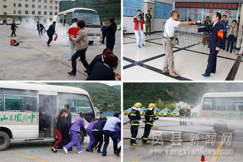 紧接着,一场紧张的消防应急演练在汽车站停车场上演。模拟车辆车内冒出滚滚浓烟,驾驶员立即停车,大火烧毁电器设备致使车门无法打开,乘务员及一名乘客使用安全锤迅速击碎一块侧窗玻璃,引导部分乘客从车窗逃离,同时,驾驶员立即手动打开车门组织车上旅客逃离,经司乘人员的迅速处置将全部乘客疏散到安全位置。驾驶员立即拨打110,请求消防队支援,并使用随车灭火器灭火自救。乘务员立即拨打公司安技科求救,安技科接到报告后第一时间赶到现场,及时向上级报告情况,启动突发火灾事故三级应急预案,布置消防任务。同时,乘务员向120急救中心和保险公司求救。在各参与处置部门的密切配合下,火灾车辆火情全部扑灭,受伤人员送往县医院进行救治,其他乘客安全转移。