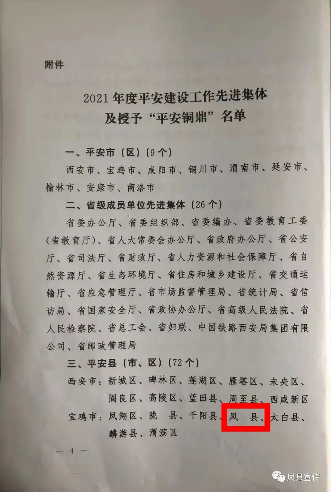 4月21日,从平安陕西建设工作会议上获悉,凤县被表彰为2021年度“省级平安县”,这是凤县继2019年、2020年之后,再次获此项殊荣。