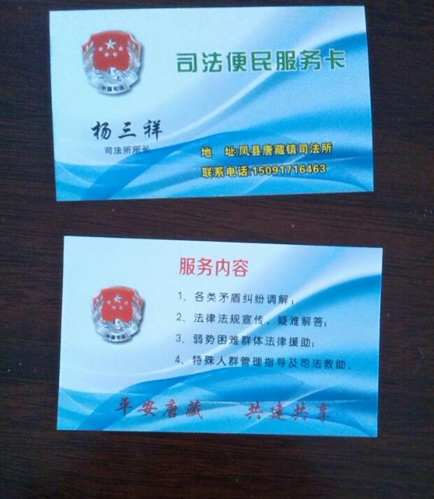 | 近日,一张张印有姓名、联系电话和服务内容的“司法便民服务卡”陆续发放到唐藏镇群众的手里。这是随着党的群众路线的深入开展,唐藏司法所紧紧围绕“为民服务,打造平安唐藏”的理念,继续转变工作思路创新工作方式的又一新举措。