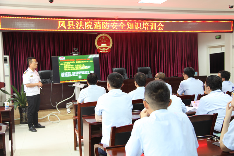 为进一步提高法院干警的消防安全意识,普及消防安全知识,增强干警有效防御火灾能力。8月30日,凤县人民法院邀请宝鸡市居必安消防科教中心消防培训教官李喜龙对全院干警进行了消防安全知识专题讲座和培训。 培训会上,李喜龙教官以现实中的典型火灾案例入手,利用现场视频及图片还原了真实的火灾现场,对在场干警造成了强烈的心灵冲击。随后,李教官又详细讲解了火灾发生的种类、如何预防火灾、如何展开自救及消防工具的使用等方面知识,讲解内容深入浅出,通俗易懂,现场气氛十分热烈,使广大干警在较短的培训时间里,最大可能的吸收掌握了消防安全技能的基本要领。